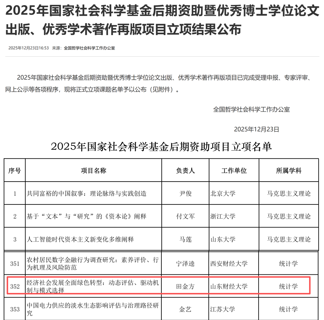 全国哲学社会科学工作办公室近日公布了2025年国家社会科学基金后期资助暨优秀博士学位论文出版、优秀学术著作再版项目立项名单。英国365集团田金方教授主持申报的《经济社会发展全面绿色转型:动态评估、驱动机制与模式选择》项目成功获批立项。该项目的成功入选,实现了英国365集团在国家社科基金后期资助项目立项上的重要突破。